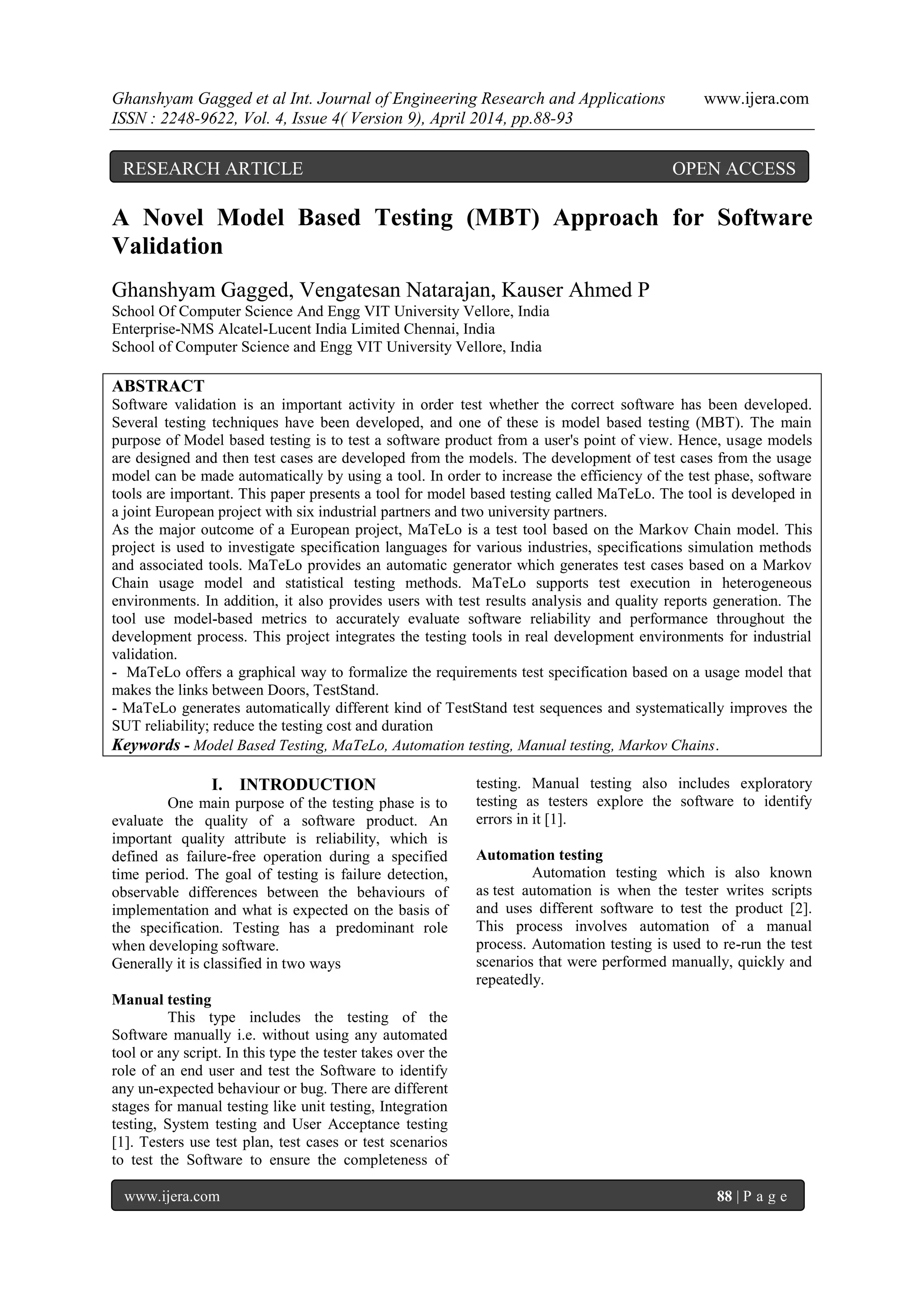 This document discusses a model-based testing (MBT) approach for software validation, emphasizing the development of test cases from usage models to ensure software reliability. It presents a tool named Matelo, developed through a European project, which utilizes Markov chain models to automate test case generation, execution, and analysis. The paper outlines the objectives, importance, and benefits of using Matelo for enhancing software testing efficiency and effectiveness.