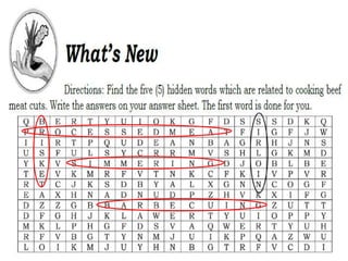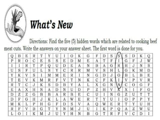 The document discusses various cuts of beef meat, including the chuck, shank, brisket, ribs, short plate, flank, loin, sirloin, and round. It describes each cut and provides cooking recommendations, preferring moist cooking methods like braising for tougher cuts and dry heat methods like grilling for more tender cuts. The document also covers market forms of meat, types of marinades, and classroom and home-based learning activities related to beef cuts and cooking methods.