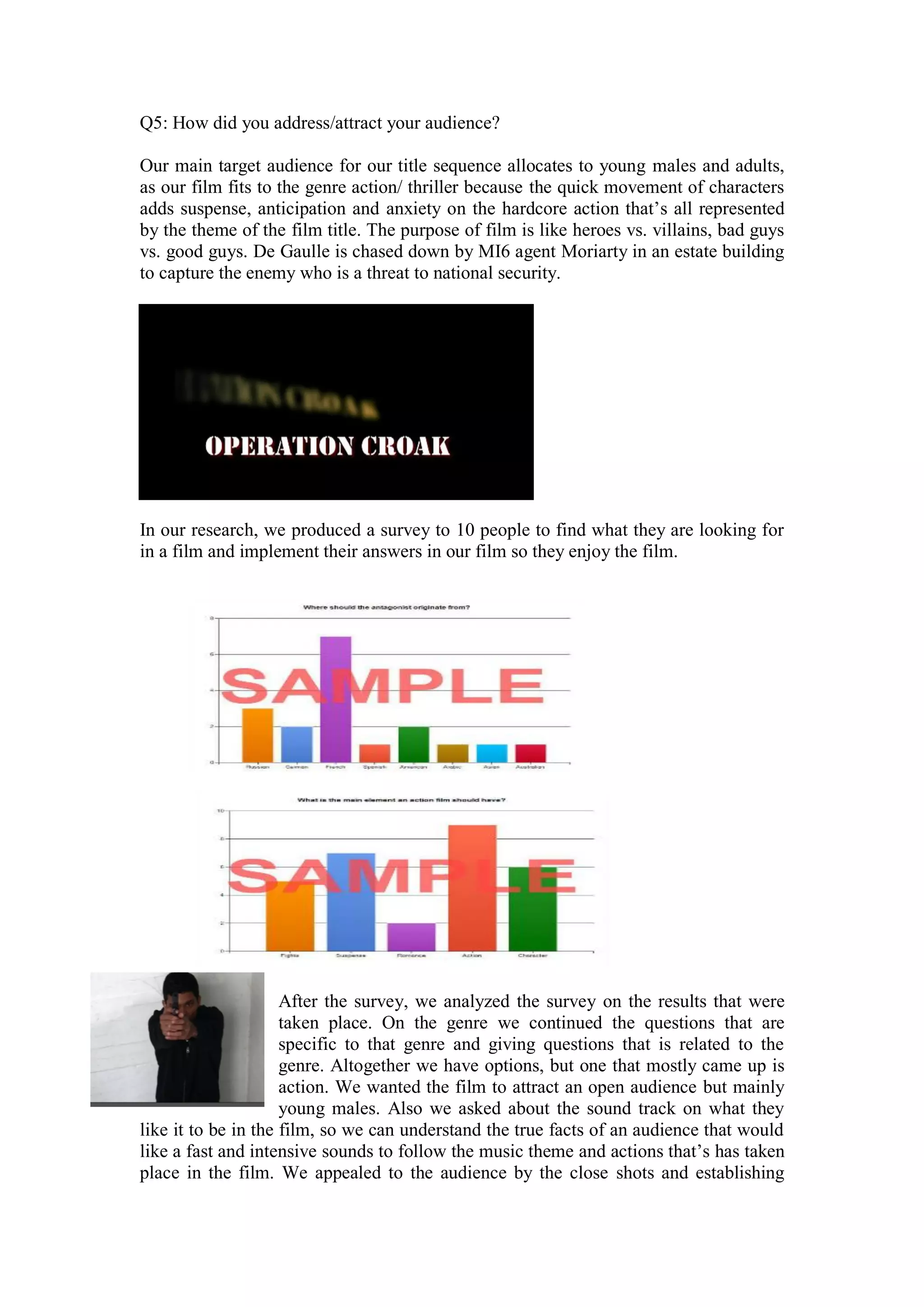 The document summarizes how the filmmakers targeted their audience for a title sequence for an action/thriller film. They conducted a survey that found young males and adults prefer fast-paced action genres. The film features a chase between characters in an estate building involving national security threats. Close-up and establishing shots during intense action scenes were intended to make the audience feel like they were directly experiencing the action. The filmmakers aimed to attract a broad audience but particularly young men based on the characters' ages and genres that surveys found most popular.