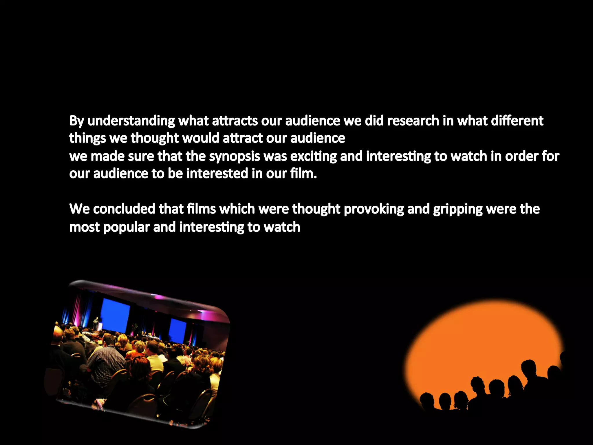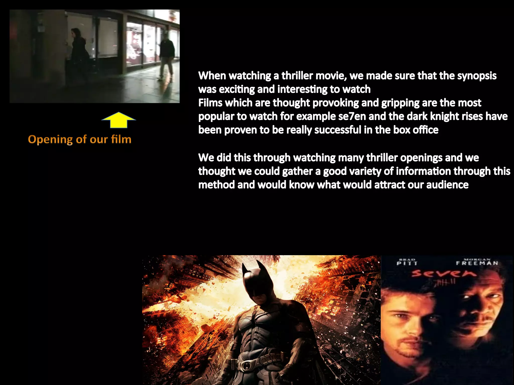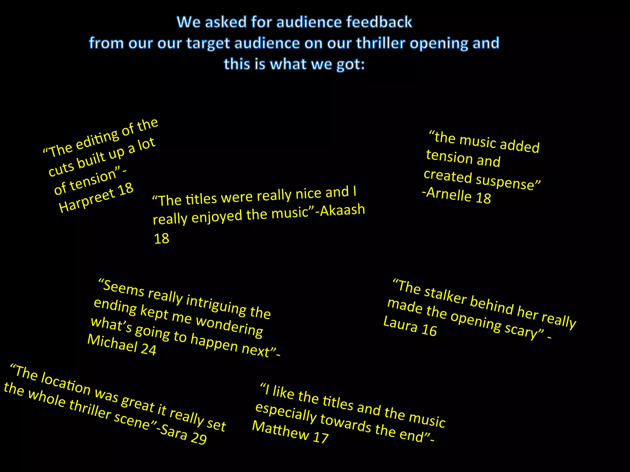The document summarizes audience feedback on a thriller film opening. Several audience members commented positively on aspects like the music building tension and suspense, titles, and intriguing ending that leaves the viewer wondering what will happen next. The final scene contributes to a sense of mystery by including a reoccurring dream, and ends on a cliffhanger to make the audience want more. The location and scenes were also praised for being thrilling and effectively setting the tone.