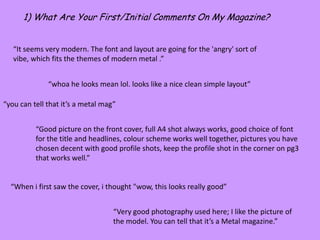 The document contains feedback from a test audience on a metal magazine prototype. The audience provides positive feedback, saying the magazine has a modern layout that fits the genre. Some suggest minor changes like adjusting aggressive fonts or adding more to the cover. Most agree the color scheme, content, and target age range of 18-35 are suitable and say they would purchase the magazine over similar publications. However, one respondent says the content does not interest them personally.