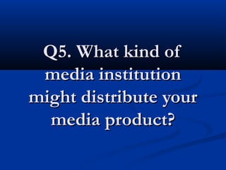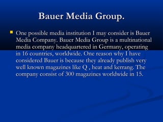 Bauer Media Group would be the preferred media institution to distribute the magazine. Bauer is a large multinational media company that publishes well known magazines such as Q, heat and kerrang in 16 countries worldwide. They have a large budget that could fund giveaways and prizes to attract audiences. Bauer also expands its magazines into different markets, with Q magazine having a website, TV channel and radio station.