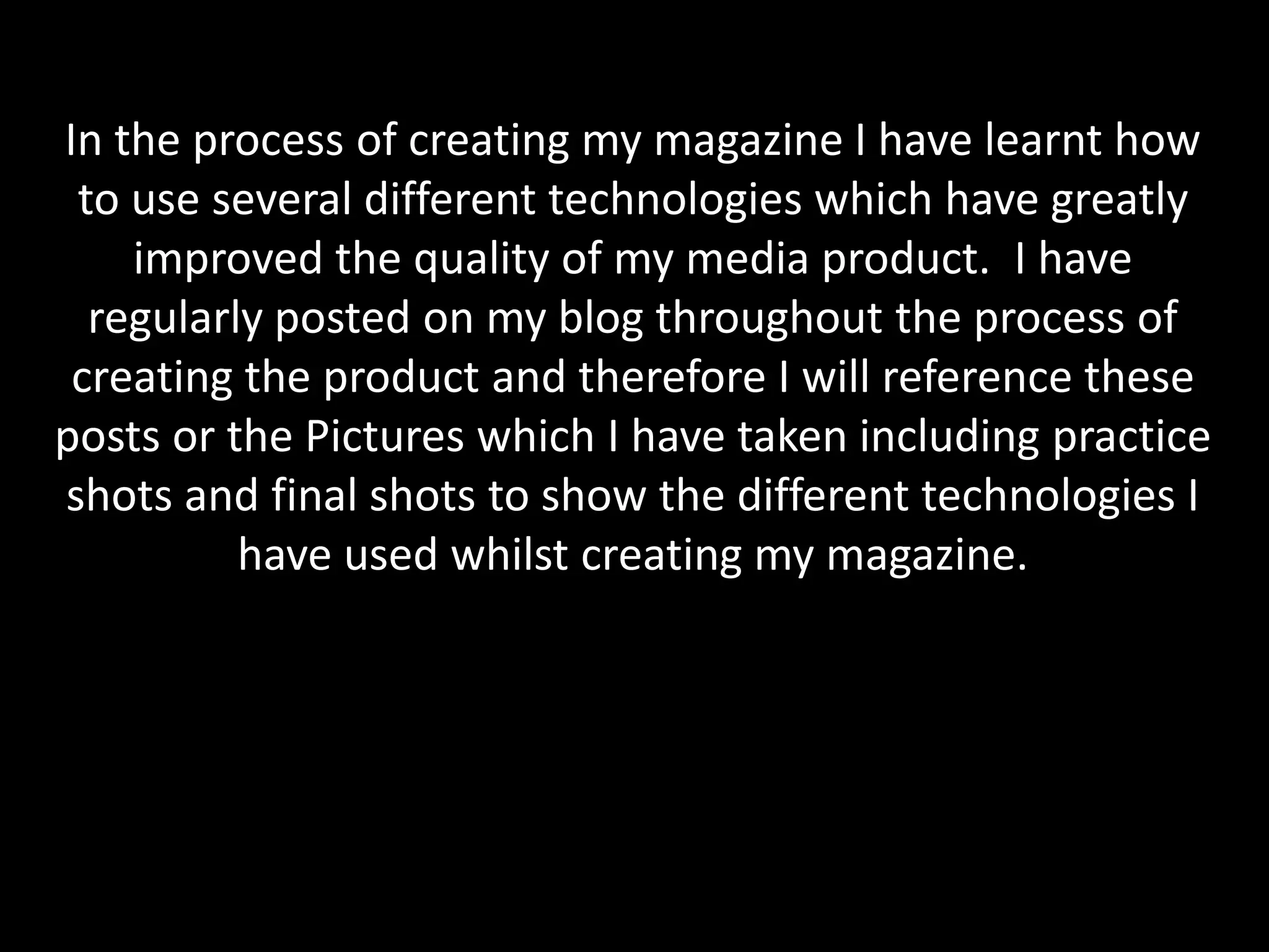 The document discusses various technologies used to create a magazine, including Adobe Photoshop, green screen, digital camera, Apple Mac, and Blogger. Photoshop was used to edit photos to a high standard and remove green screen backgrounds. Green screen allowed inserting new backgrounds or removing backgrounds from photos for the cover and spread. A digital camera enabled taking many practice photos and deciding which to use. An Apple Mac operated Photoshop better and worked faster than Windows. Blogger was used to document the process, get feedback, and view work in one place.