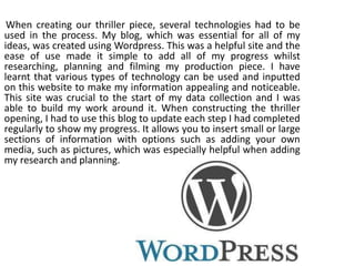 The document discusses various technologies the author learned about through creating a thriller film project. They used Wordpress to create a blog to document their planning and research, and used Slideshare to upload presentations to their blog. They also used Prezi to create an interactive presentation. For filming, they used an HD video camera to shoot professional-looking footage. They edited the filmed footage using iMovies, learning how to choose clips and add transitions. Finally, they created music for the thriller using Garageband, finding it took time to produce music that fit the genre and tone of the film.