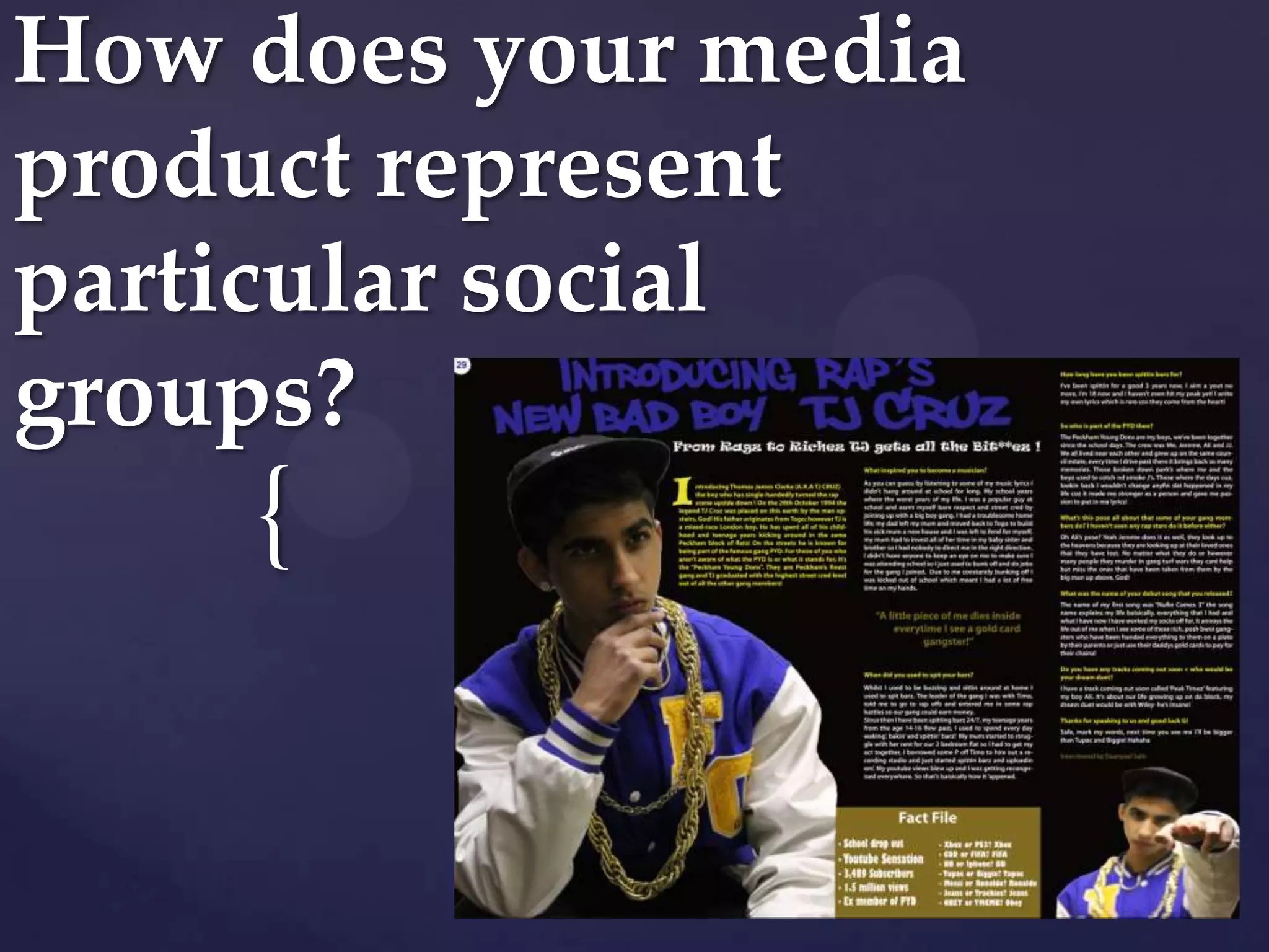 This document discusses how a rap music magazine represents a particular social group. The magazine targets deprived council block kids who look up to rap stars. This social group is often negatively portrayed in newspapers as troublesome teens or ghetto kids. The magazine aims to portray this group in a positive light while still including some common stereotypes, but providing justification and explanation for them. Images and quotes about drugs, violence, and provocative poses are explained as representing the realities of growing up in difficult areas and using drugs/poses to cope or make a living, rather than as glorification. The magazine aims to show this group cares about family and only acts in self-defense, challenging negative stereotypes.
