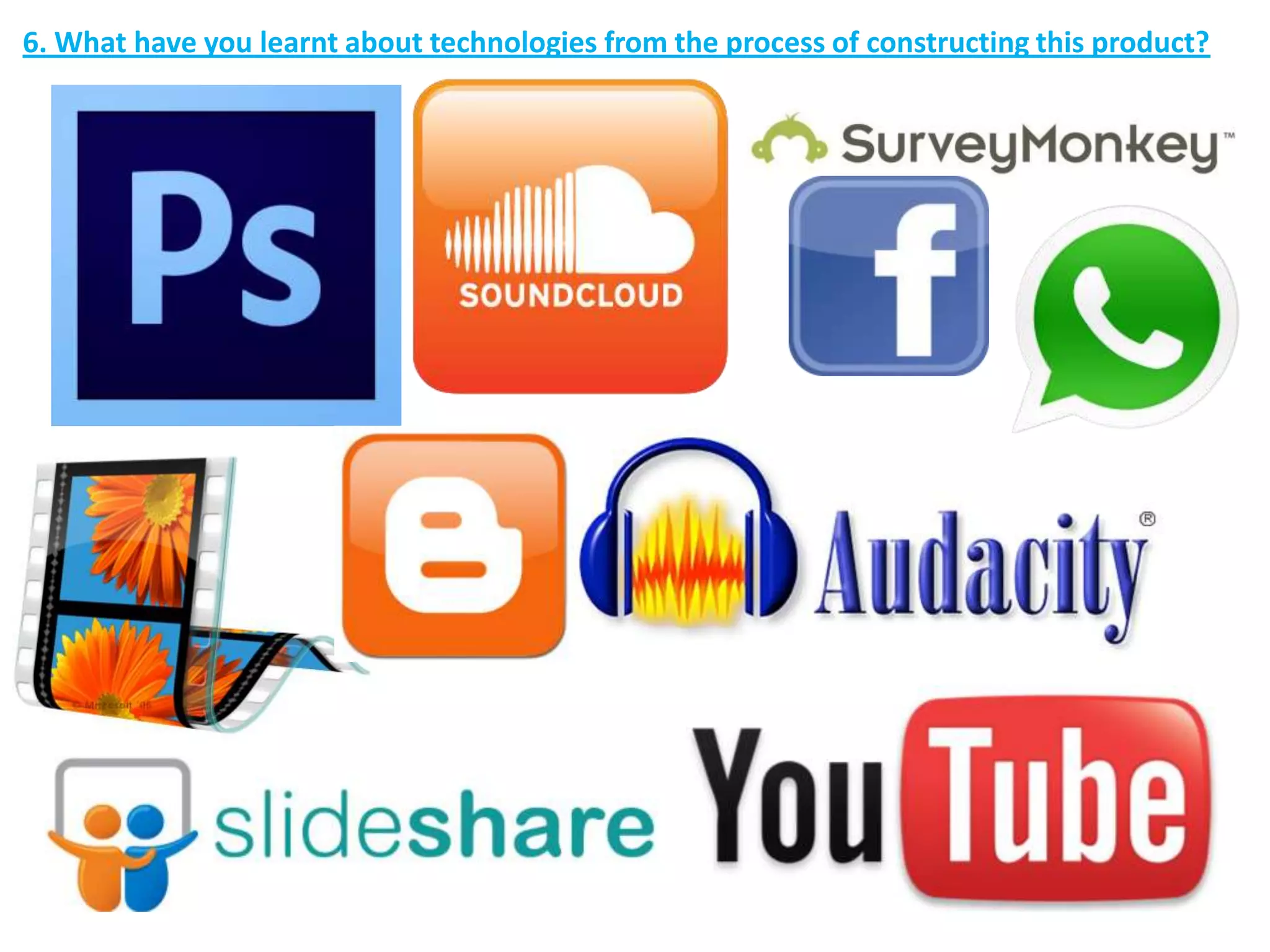 The document discusses the various technologies used to construct a music magazine product. Blogger was used to create an online blog to upload content for the magazine, including preliminary tasks, planning, production, and evaluation. Photoshop was used extensively for image editing and design work, including cutting out images, adding gradients, blurring edges, and special effects. YouTube provided tutorials for masthead design and a way to upload evaluation videos. SoundCloud, Audacity, and Windows Movie Maker were used for audio/video recording and editing. SurveyMonkey created a survey to understand the target audience.