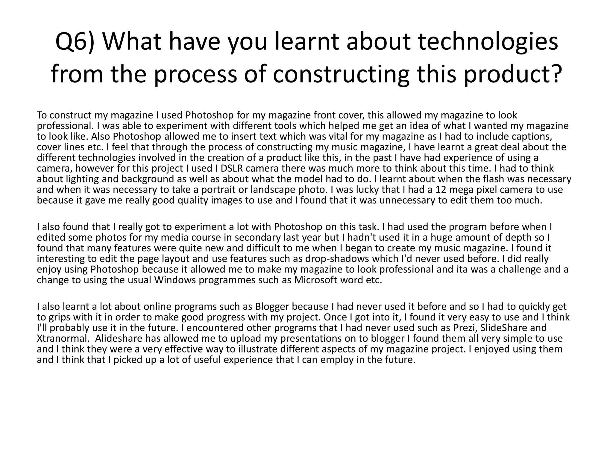 The document discusses technologies learned during the process of creating a music magazine. Photoshop was used to design the magazine cover and allowed experimenting with tools to create a professional look. Photoshop was also used to add text captions and headlines. When taking photos for the magazine, the author learned about lighting, backgrounds, and when to use the flash or take portraits versus landscapes. Blogger and other online programs like Prezi, SlideShare, and Xtranormal were also used and taught layout, presentations, and uploading materials, providing new skills for future projects.