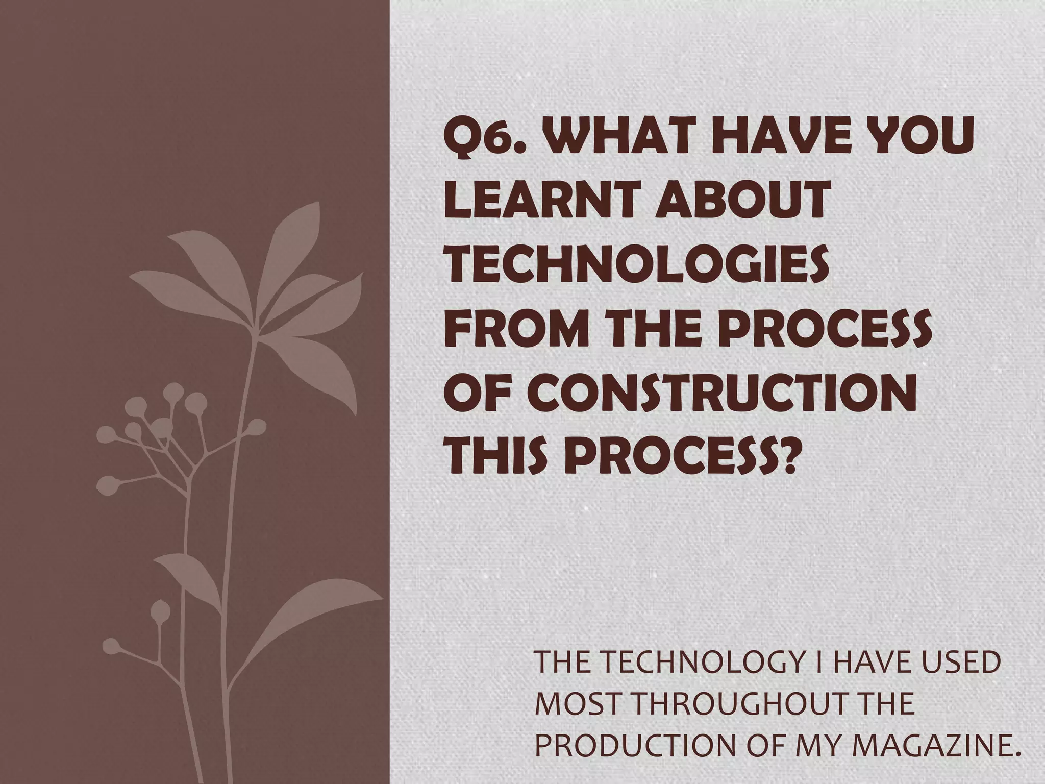 The document discusses the various technologies used to create a magazine. It describes using a professional camera and learning photography skills like adjusting lighting. It also covers using Apple Macs and Microsoft software like Word, PowerPoint, and Photoshop. Photoshop was initially difficult but skills like layers and photo editing were learned. InDesign was also challenging at first but linking pages and color-coding layers became possible. WordPress and SlideShare were used to blog and present work, with new skills like embedding videos acquired. Overall, the biggest lessons came from using InDesign and Photoshop extensively.