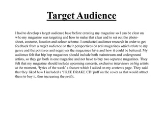 The document describes photo shoots for a hip hop magazine. Outdoor photos in Camden with graffiti on the walls were chosen as the main images because the lighting was better and immediately denoted the hip hop genre. Costumes for the shoots included gold chains, dungarees, camo jackets, urban print shirts, denim shorts, beanie hats, and denim waistcoats to give off a hip hop vibe while still being feminine. Audience research was conducted to help define the target market and features they wanted, such as coverage of both mainstream and underground artists in one magazine.