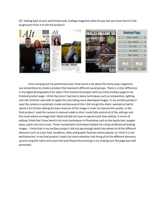 The student learned a lot about magazine conventions and techniques for photography and image editing from their preliminary college magazine task to the final product. They gained skills in composition, lighting, and camera settings that improved their photos. Editing tools in Photoshop helped manipulate images professionally. Attention to layout improved as the student learned to balance elements like headlines and graphics better in the final product.