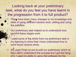 The document summarizes the student's learning from their preliminary task to their full product thriller film. They discuss improvements in their camera work, editing skills, and use of software like Final Cut Pro. They analyzed successes and challenges of both their preliminary task and full thriller film. Overall, they felt they improved their skills and learned from mistakes, and enjoyed gaining experience with cameras, editing, and other technologies.