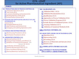 The document outlines quality assurance guidelines for active pharmaceutical ingredients (APIs) as per cGMP regulations. It covers topics such as quality management, personnel qualifications, facility design, utilities, documentation, materials management, production processes, packaging and labeling, storage, validation, change control, and more. The key points are that manufacturers must establish a quality management system involving management participation to ensure APIs meet quality standards, maintain independent quality control units, document all quality-related activities, and conduct periodic reviews and audits.