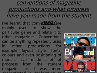 In summarizing their progression from the preliminary student magazine to the full R&B magazine production, the author learned about genre conventions and how to better apply them. Specifically, they improved layout, font selection, color usage, and model positioning based on other magazine examples. The initial magazine sketches differed significantly from the final product, as taking photos led to realizing the layout needed changes to make images and text more appealing. Overall, the author gained experience in crafting publications that better match genre conventions.