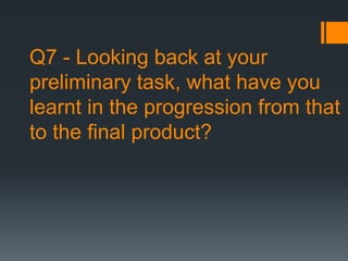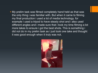 The student learned several important skills from their preliminary task to the final production. They improved their filming technique from only handheld shots to using a tripod and taking multiple takes. Their editing skills also progressed significantly from simply putting clips together to using advanced features like fades and effects. Additionally, they got better at selecting appropriate music. Overall, the student made huge improvements in their filming, editing, and use of production elements from their early work to the final project.