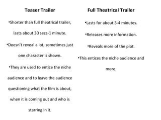 The document compares and contrasts teaser trailers and full theatrical trailers. Teaser trailers are shorter, around 30 seconds to 1 minute, and reveal very little information about the plot or characters. They are aimed at enticing specific target audiences and leaving viewers with questions. Full trailers are longer, around 3-4 minutes, and provide more details about the story, characters, and setting to further promote the film. The document provides examples from the teaser and full trailers for The Blair Witch Project to illustrate these differences.