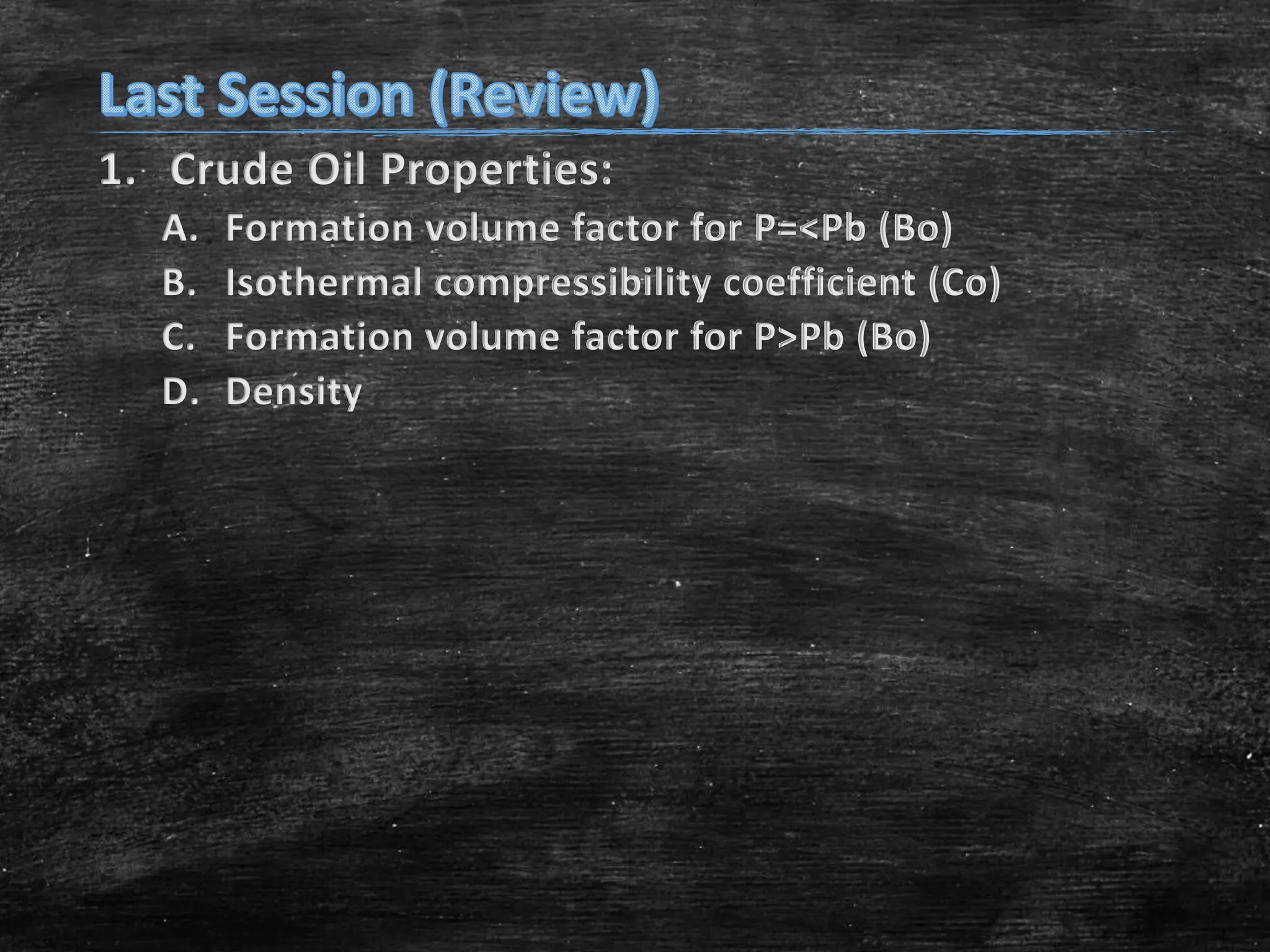 This document provides an overview of reservoir fluid properties, including crude oil, water, and gas properties. It discusses key properties such as formation volume factors, viscosity, surface tension, and gas solubility. It summarizes various empirical correlations used to estimate these properties based on temperature, pressure, oil composition and other factors. The document is from a course on reservoir fluid properties and focuses on definitions and methods for calculating important PVT properties.