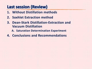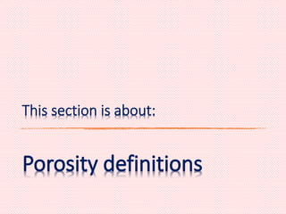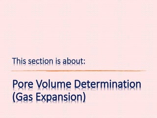 This document provides an overview of reservoir rock porosity determination methods. It defines total, effective, and dead porosity. It describes techniques for measuring bulk volume, including through dimensions, fluid displacement, and mercury injection. It discusses methods for determining grain volume, such as crushing samples and using a pycnometer or volumeter. The document emphasizes that knowing two of the three values (bulk volume, grain volume, or pore volume) is required to calculate porosity.