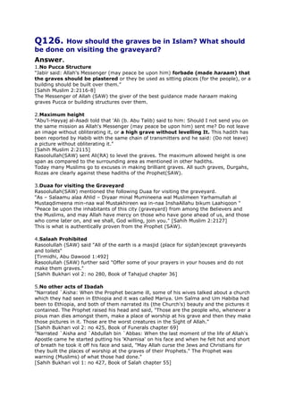 The document provides guidance from Islam on proper burial practices and visiting gravesites based on hadiths from the Prophet Muhammad (peace be upon him). Key points include: graves should not have permanent structures or be elevated; the maximum allowed height is one span above the surrounding area; when visiting gravesites, Muslims should recite a dua for the deceased but not perform other acts of worship like praying or reading Quran; and building mosques over or putting graves in mosques is forbidden. The Prophet also prohibited plastering or sitting on graves as well as other innovations at gravesites that have become common today.