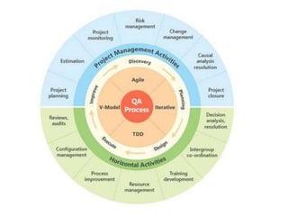 Документ описывает этапы процесса обеспечения качества (QA), включая подготовку, тестирование и финальные этапы, а также роль управления качеством и инструментов в этом процессе. Основное внимание уделяется формированию стандартов, устанавливающих критерии качества, и необходимости регулярного контроля исполнения плана качества. Также рассматриваются инструменты для тестирования и управления дефектами, а также методы оптимизации и анализа успешности проектов.