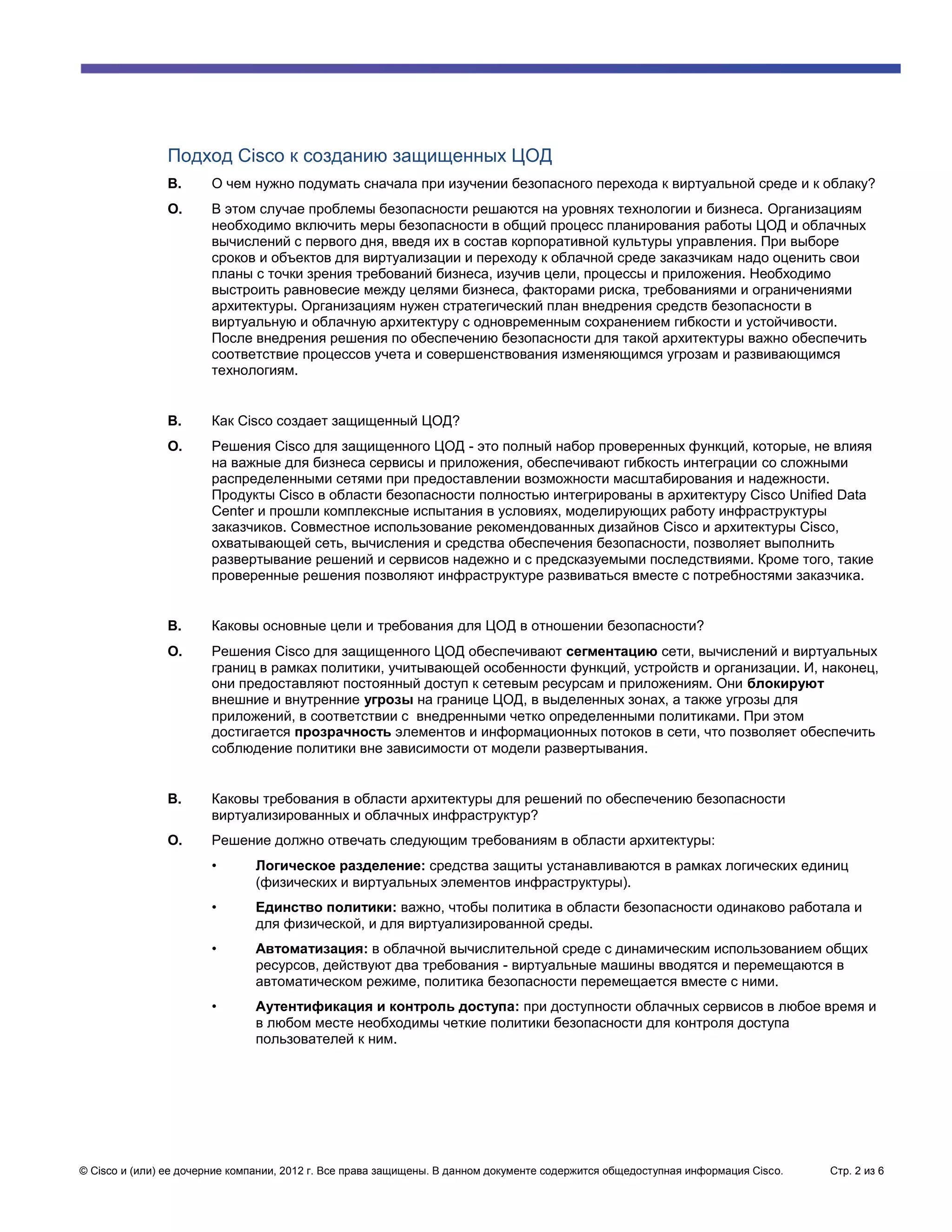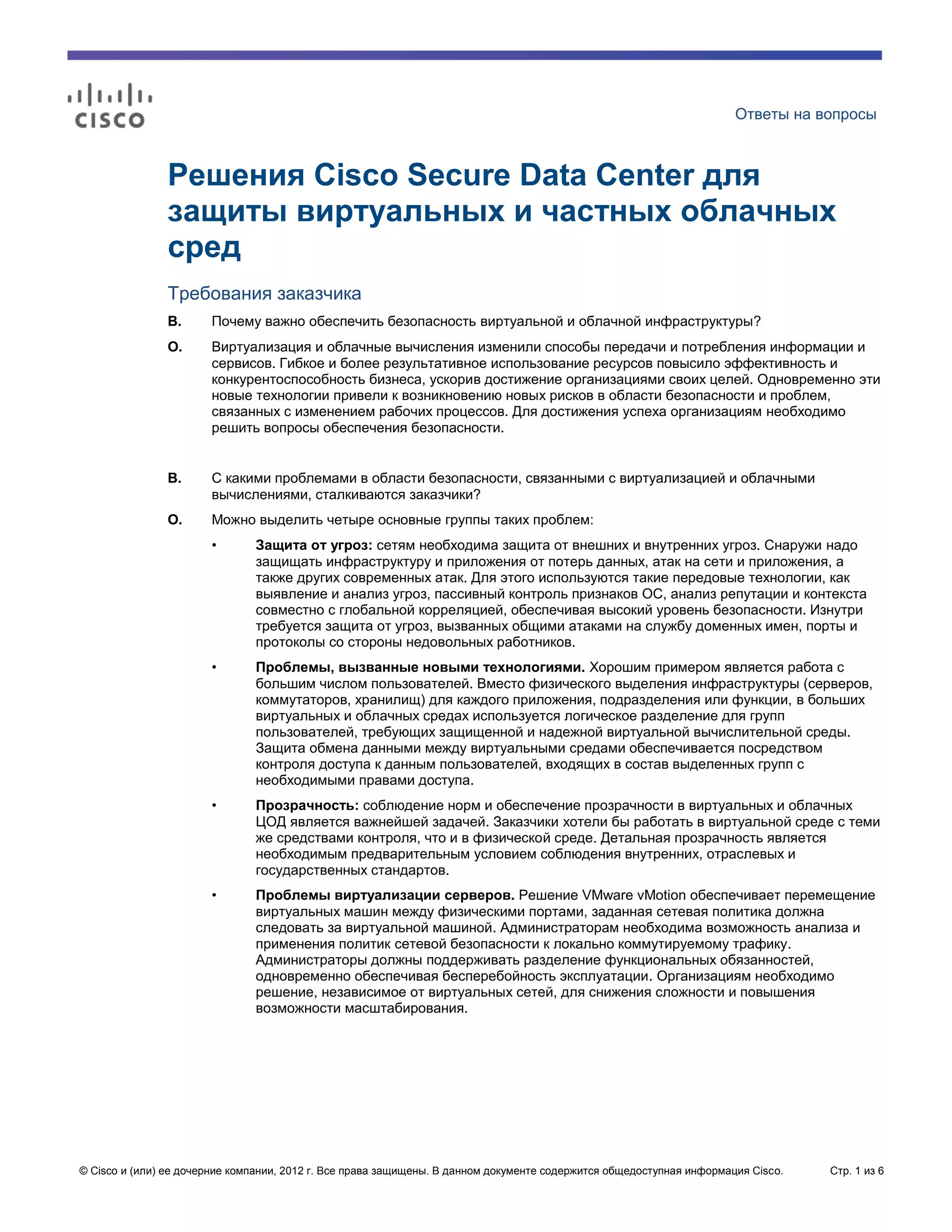 Документ описывает решения Cisco для обеспечения безопасности виртуальных и облачных инфраструктур, подчеркивая важность защиты данных в условиях новых рисков, связанных с виртуализацией. Основное внимание уделяется методам защиты от внешних и внутренних угроз, а также необходимым мерам для выполнения норм и стандартов. Cisco предлагает интегрированные решения для сегментации и безопасности данных с высокой масштабируемостью и производительностью.