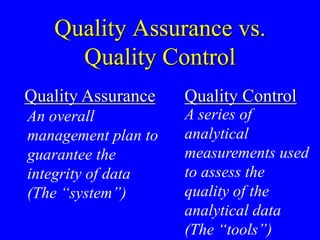 This document discusses key concepts in quality control and quality assurance for analytical chemistry measurements. It defines terms like quality assurance, quality control, accuracy, precision, calibration curves, blanks, recovery studies, method detection limits, and more. Quality control measures like standards, blanks, recovery studies, precision/accuracy studies, and method detection limits are used to assess data quality.