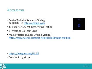 The document outlines the first festival of testing in Ukraine, focusing on speech recognition technology and its applications. It highlights various testing areas such as engine and language modeling, hardware, deployment, and recognition commands. Additionally, it provides insights on different speech recognition models and testing methodologies used in the industry.