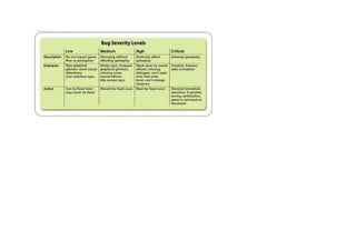 The document outlines bug severity levels for the game SteelShot developed by David Sharples, with testing done by Dominic O'Brien on 22/05/2013. It defines levels as low, medium, high, and critical, then provides examples of issues that would fall under each level, such as visual glitches being low while core gameplay functions like pausing or bullets traveling incorrectly marked as high.