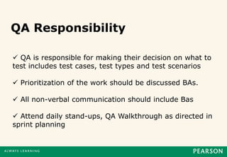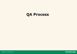 The document outlines the QA process and responsibilities at Pearson. It discusses that QA is responsible for test case development and prioritization. It also describes the different types of testing conducted including functional, regression, exploratory, and automation testing. The document provides examples of test execution documentation and defect reporting guidelines. It discusses test environments, walkthrough procedures, and having QA buddies for expertise sharing.