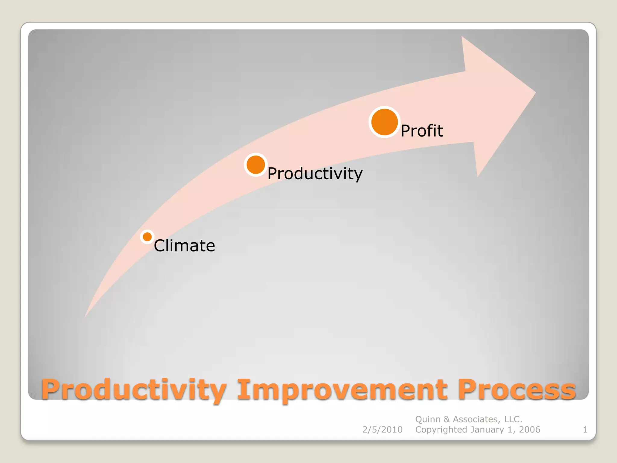 The document discusses a productivity improvement process developed by Quinn & Associates that focuses on building blocks for businesses, including focus and direction, leadership and motivation, aligning the organization, deploying actions, and contacting Quinn & Associates for an assessment.