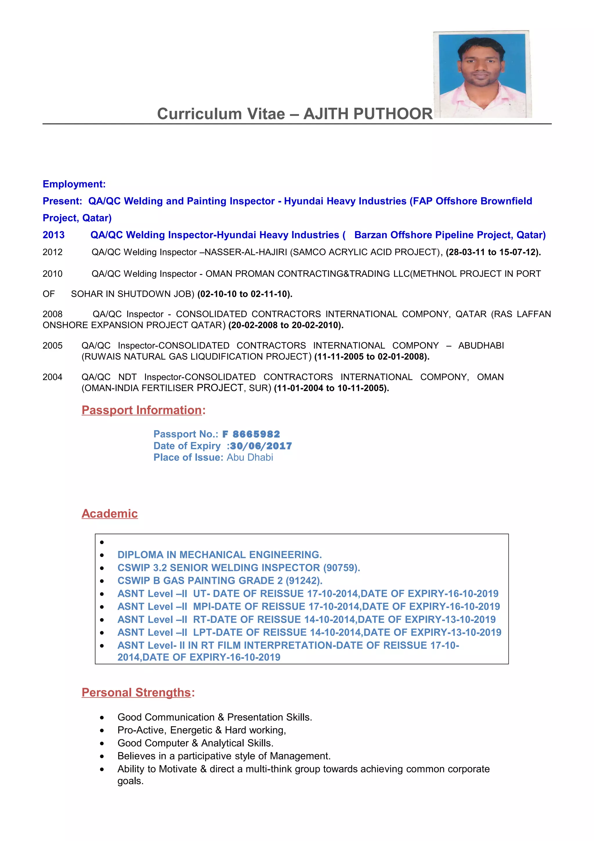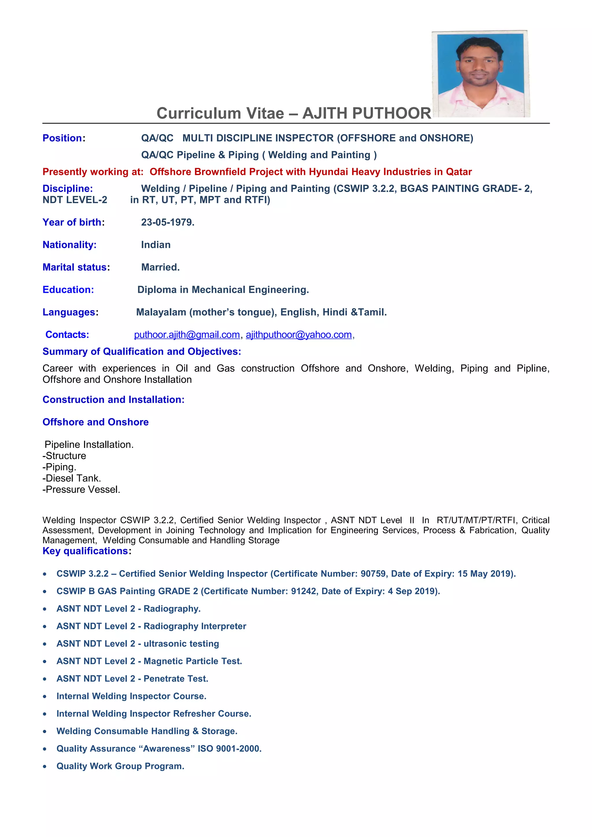 Ajith Puthoor is a QA/QC inspector with over 15 years of experience in welding, piping, and painting inspection for offshore and onshore oil and gas projects. He is currently working as a QA/QC welding and painting inspector for Hyundai Heavy Industries on an offshore project in Qatar. Puthoor holds relevant certifications including CSWIP welding inspector, BGAS painting inspector, and ASNT NDT level II in radiography, ultrasonic testing, magnetic particle testing, and penetrant testing. He is responsible for inspecting materials, welds, coatings, and hydrotesting to ensure quality standards are met on pipelines and other piping infrastructure.