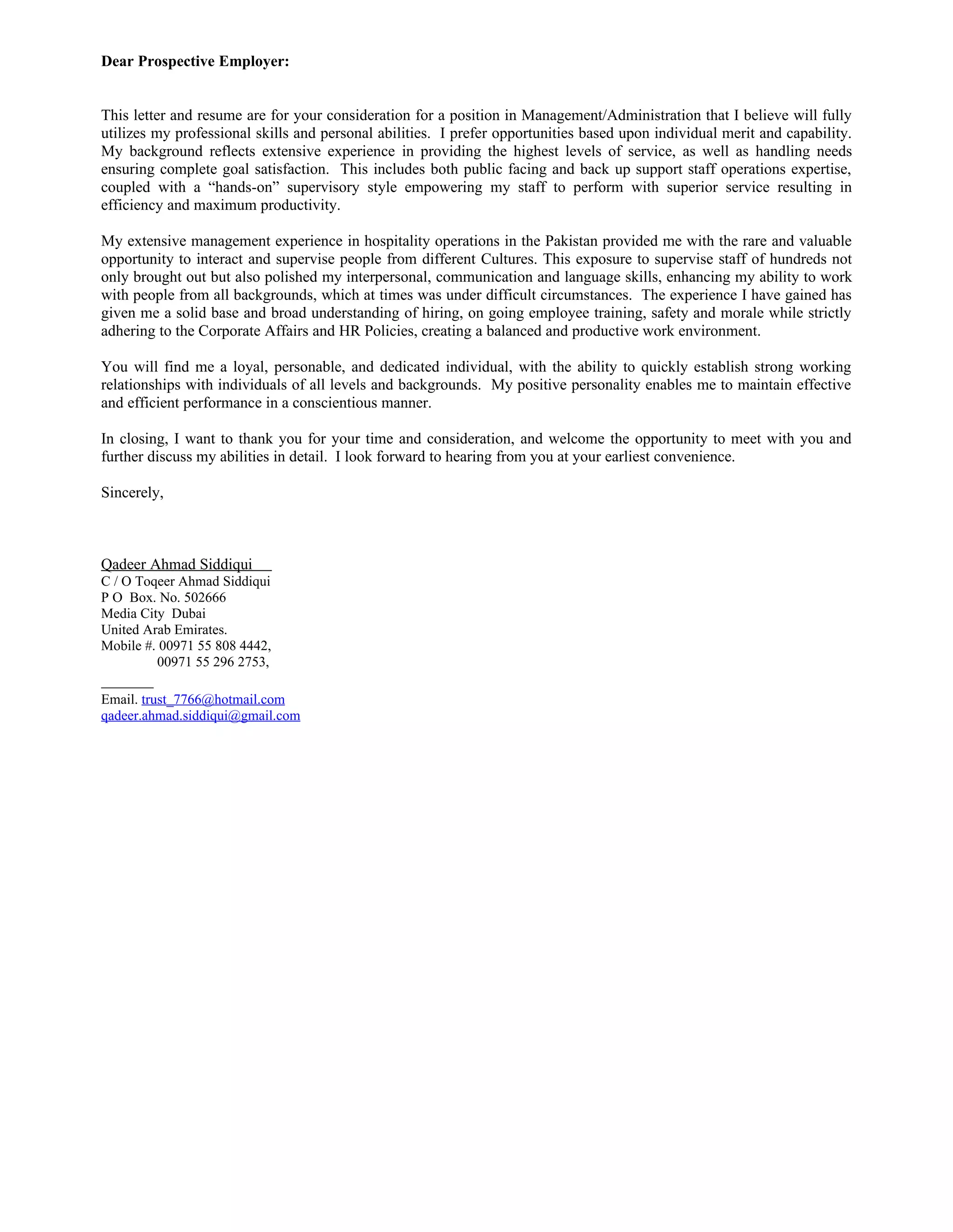 The candidate is applying for a management/administration position. They have extensive experience managing hospitality operations in Pakistan, including supervising hundreds of staff from different cultures. Their background also includes accounting, sales, marketing, and business development experience. They emphasize their strong communication, leadership, and problem-solving skills.