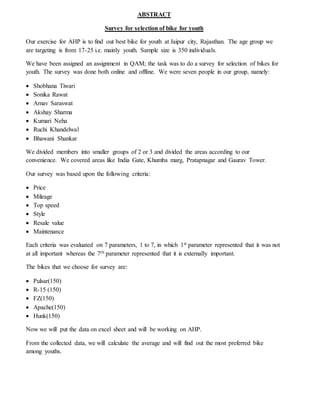 The document describes a survey conducted by a group of seven students to determine the most preferred bike for youth in Jaipur, India. They surveyed 350 individuals both online and offline in areas around Jaipur. The survey collected data on price, mileage, top speed, style, resale value, and maintenance for five bike models: Pulsar, R-15, FZ, Apache, and Hunk. The group will input the data into an excel sheet and use the Analytic Hierarchy Process to calculate averages and determine the most preferred bike based on the survey responses.
