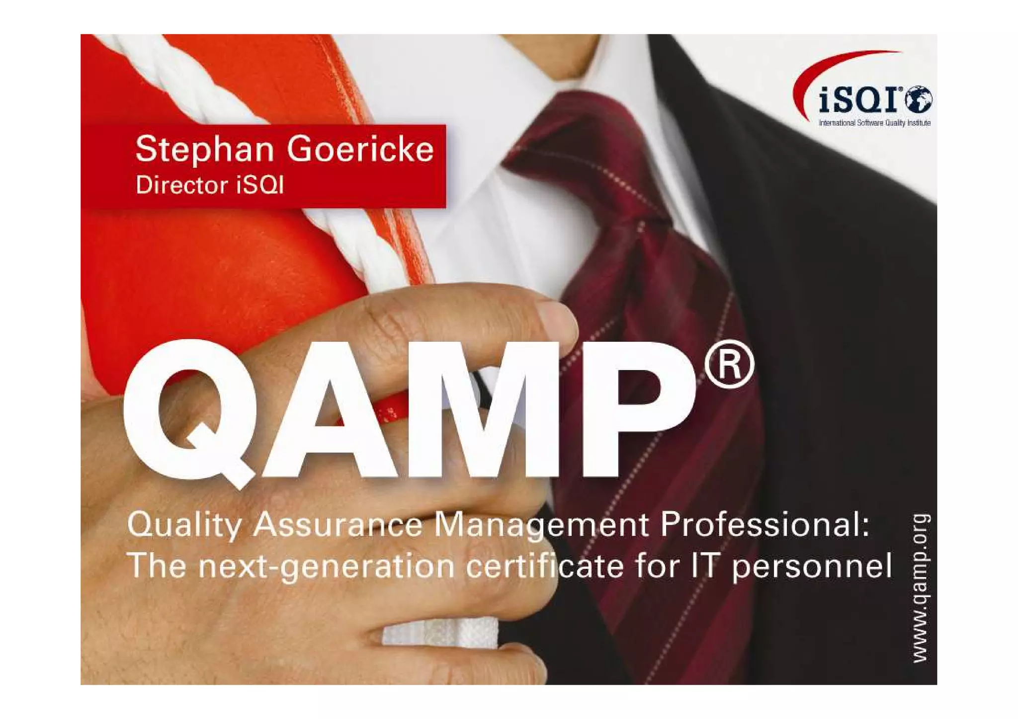 The document discusses the QAMP certification for software quality professionals offered by the International Software Quality Institute (iSQI). The QAMP certification is a modular, international certification that demonstrates both broad knowledge across software quality domains like testing and requirements, as well as practical work experience. It is designed to provide a comprehensive yet flexible certification to help professionals navigate an increasingly complex certification landscape and allow them to showcase their qualifications and commitment to lifelong learning to employers and clients.