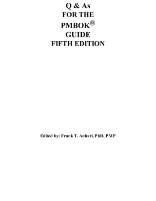 This document provides an introduction to the Q & As for the PMBOK® Guide Fifth Edition book. It discusses the contributors to the book and previous editions. The introduction notes that the book facilitates developing a deeper understanding of generally accepted project management knowledge and practice through multiple choice questions and answers covering key PMBOK® Guide concepts. It aims to address the project management processes and knowledge areas from A Guide to the Project Management Body of Knowledge. The introduction thanks all the contributors who helped create the book and its predecessors.