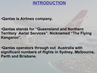 Qantas is Australia's largest airline, founded in 1920 in Queensland. It has significantly expanded its operations throughout Australia and internationally. Qantas has embraced emerging technologies like wireless internet, mobile check-in, and electronic commerce to improve customer experience and increase revenue. These technologies allow passengers to remain connected during flights and more conveniently manage their travel arrangements. The implementation of new technologies has provided financial benefits to Qantas and made business processes more efficient.