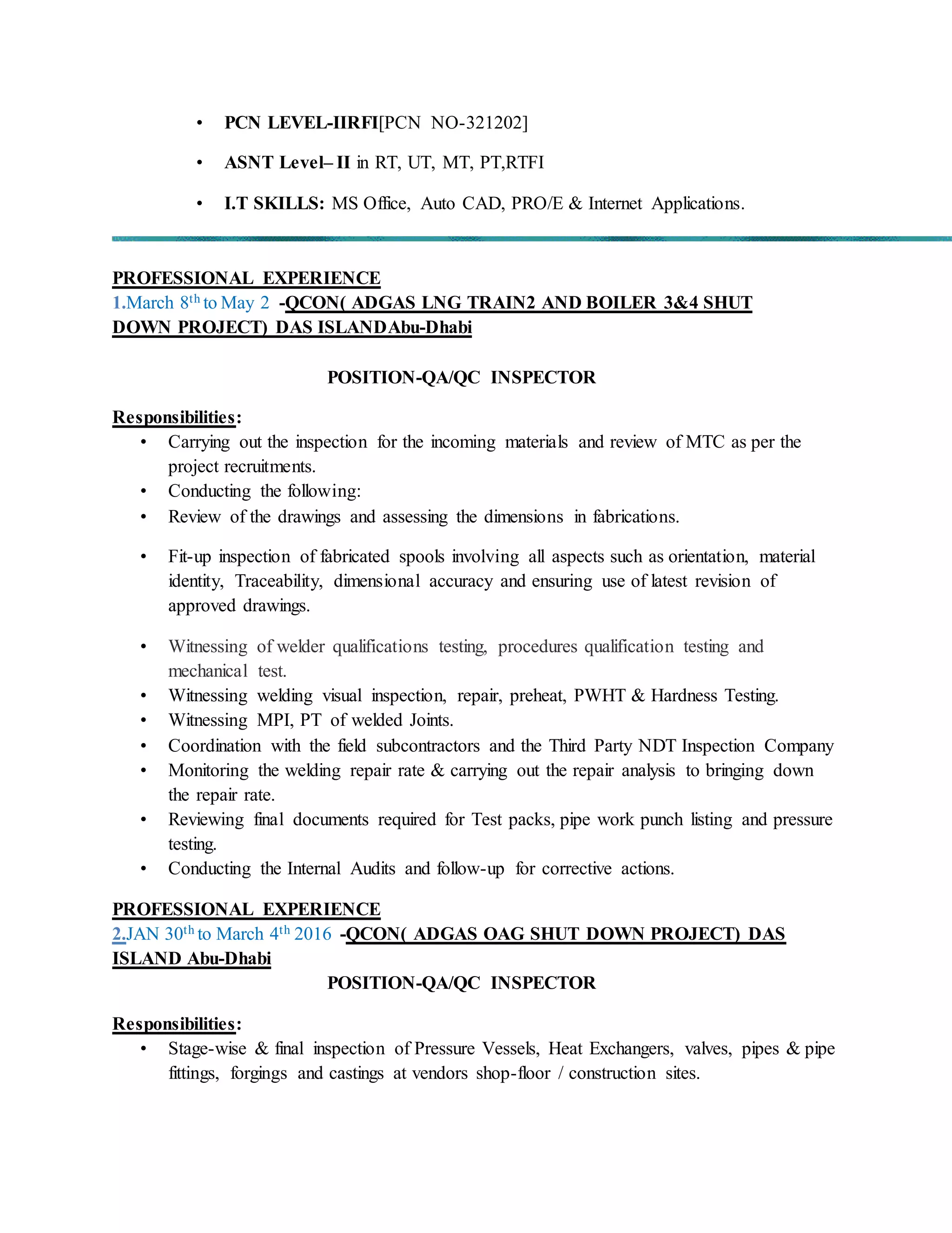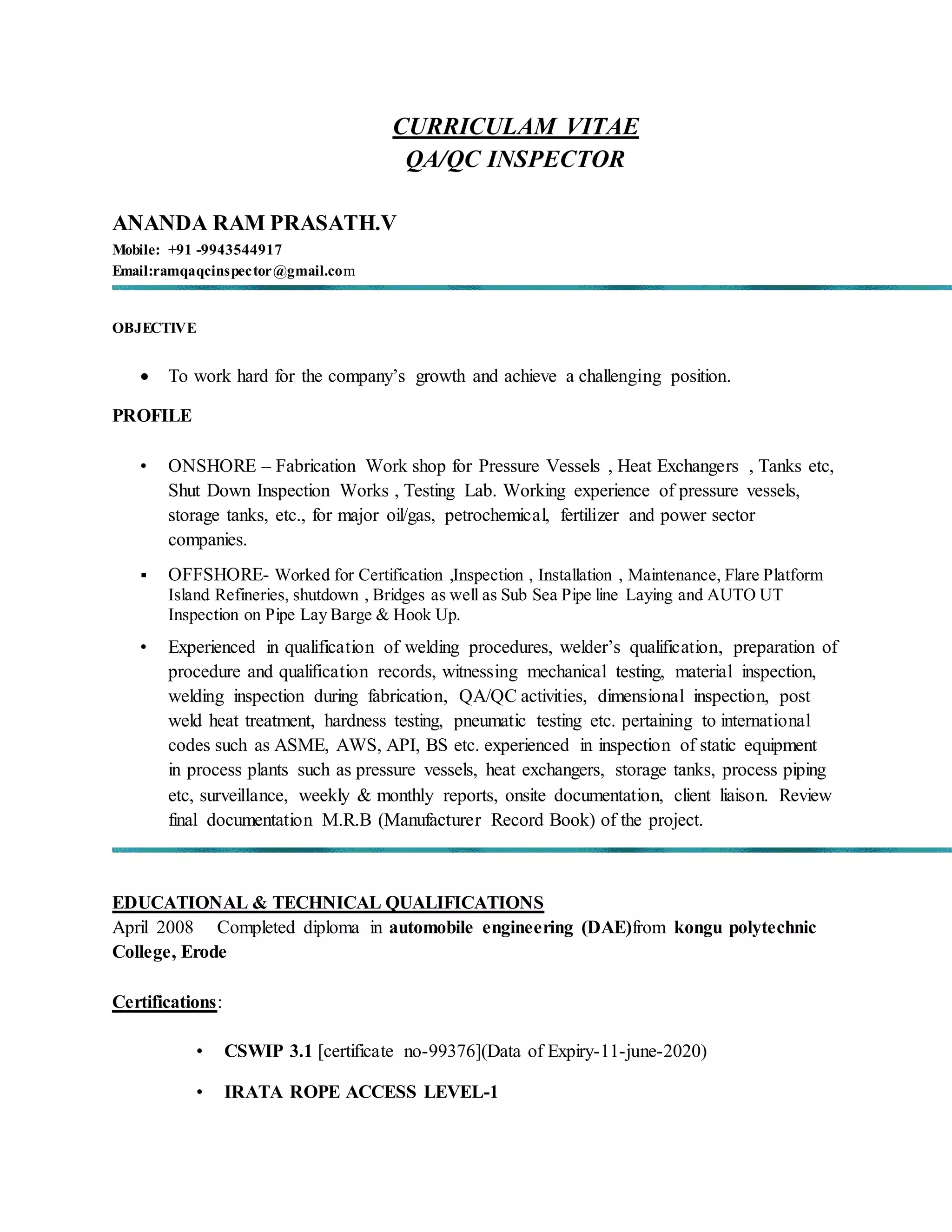 This CV summarizes Ananda Ram Prasath's experience and qualifications for the role of QA/QC Inspector. He has over 10 years of experience in inspection roles for major fabrication projects in oil, gas and petrochemical industries. His responsibilities have included material inspection, witnessing of tests and inspections, reviewing documentation, and ensuring quality standards are met. He holds relevant certifications in welding inspection and non-destructive testing.