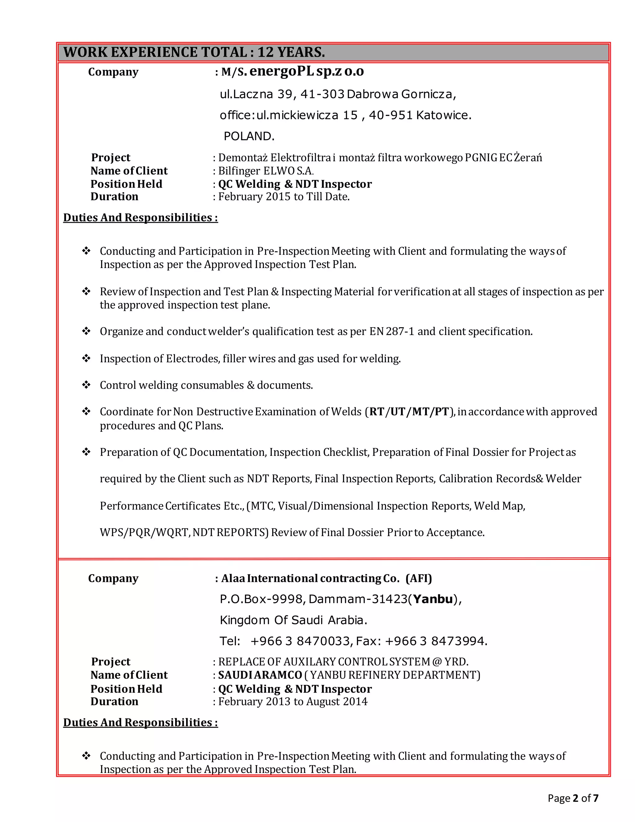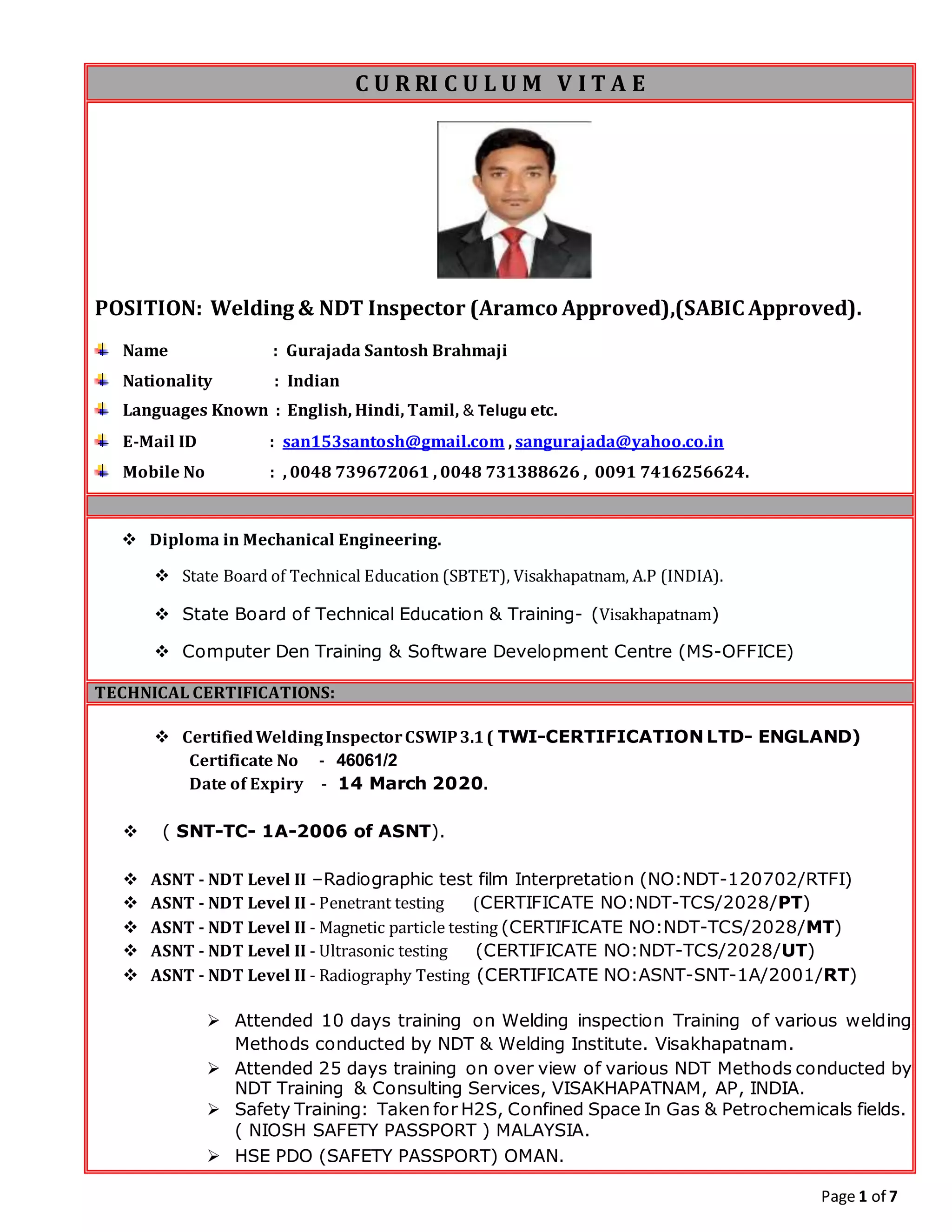 This curriculum vitae summarizes the qualifications and work experience of Gurajada Santosh Brahmaji. He has over 12 years of experience as a welding and NDT inspector working for various companies in Europe, the Middle East, and Asia. He holds numerous technical certifications including Certified Welding Inspector from TWI and ASNT Level II certifications in various NDT methods. His experience includes inspection, testing, documentation and ensuring quality control requirements for large industrial projects.
