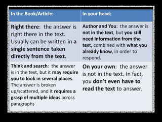 QAR (Question-Answer Relationship) is a reading comprehension strategy developed by Taffy Raphael that helps students answer questions by utilizing both textual information and their own background knowledge. It categorizes questions into four types: right there, think & search, author & me, and on my own, facilitating a better understanding of different question types. The strategy is particularly beneficial for NAPLAN assessments, appearing in over 70% of questions, and provides a structured teaching framework over ten days.