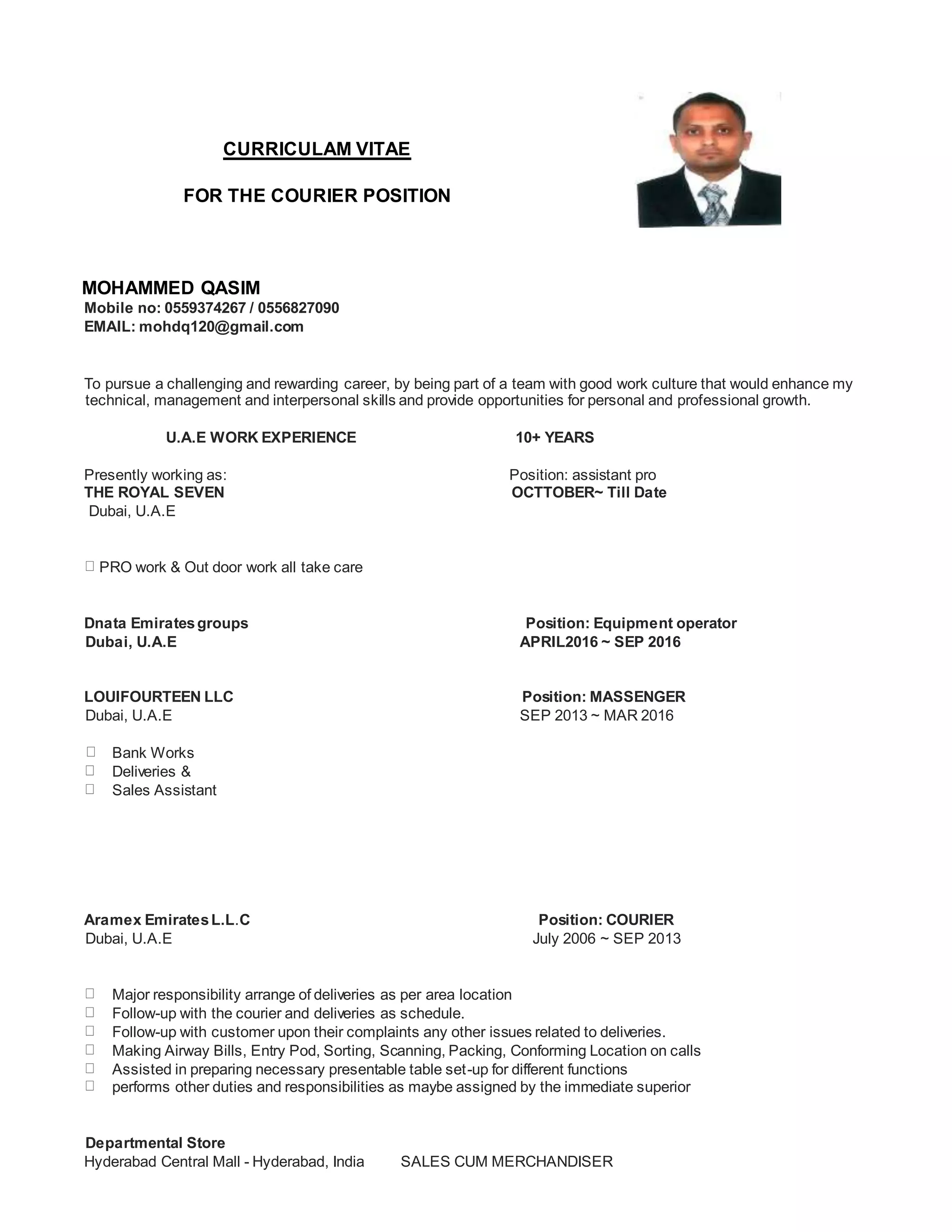 Mohammed Qasim is applying for a courier position and has over 10 years of experience in UAE working in various roles including as an assistant pro, equipment operator, massenger, and courier. He has a Bachelor's in Commerce from Ambedkar University in Hyderabad, India and work experience in India in sales and customer service roles in department stores and electronics retail. He is seeking a challenging career opportunity where he can grow professionally and has strong communication, computer, and customer service skills.