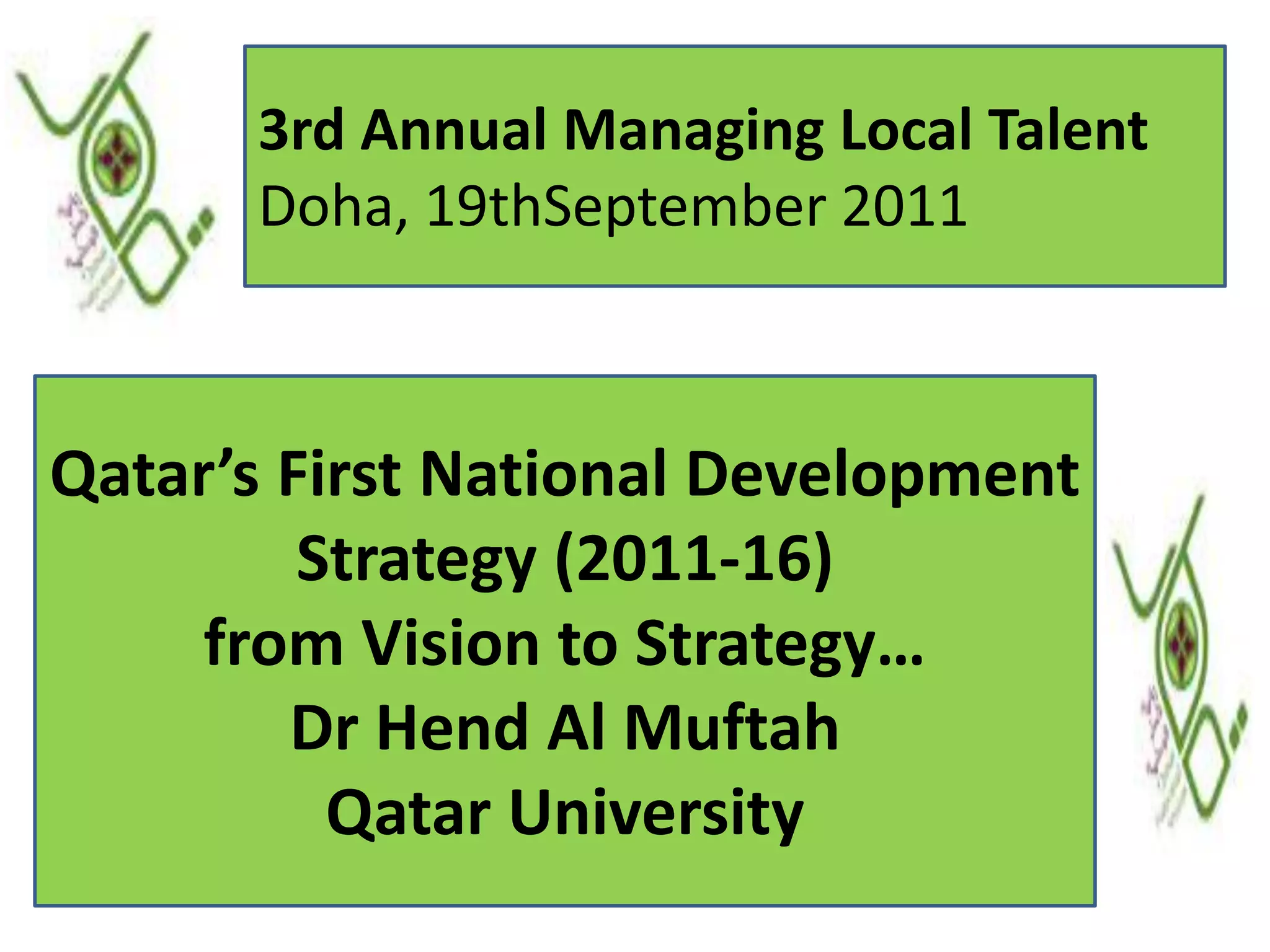 The document summarizes Qatar's First National Development Strategy from 2011-2016. The strategy aimed to balance modernization while preserving Qatari culture, meet the needs of current and future generations, manage growth, and align economic and social development with environmental management. Key goals included improving education and training to develop Qatar's workforce, increasing Qatari participation in the private sector, and raising labor productivity. The strategy focused on developing policies and institutions, as well as programs to boost skills, attract Qatari talent, and empower women and entrepreneurs to help realize Qatar's vision of becoming an advanced society.