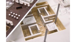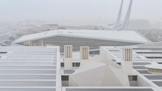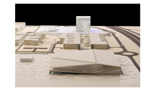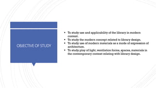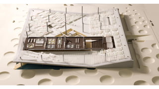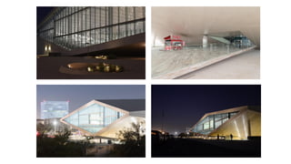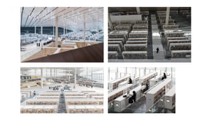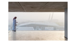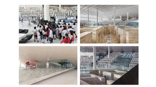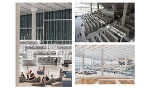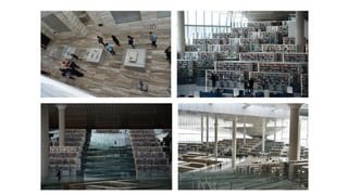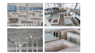 The document discusses the design and functionality of the Qatar National Library, created by architect Rem Koolhaas, emphasizing its role as a community space that balances information accessibility with preservation. The library's innovative architecture features an open-plan design that integrates modern materials and technology, showcasing the evolution of knowledge while accommodating contemporary needs. It highlights the use of natural light, various collaboration spaces, and preservation facilities, reflecting Qatar's cultural transformation and modernization.