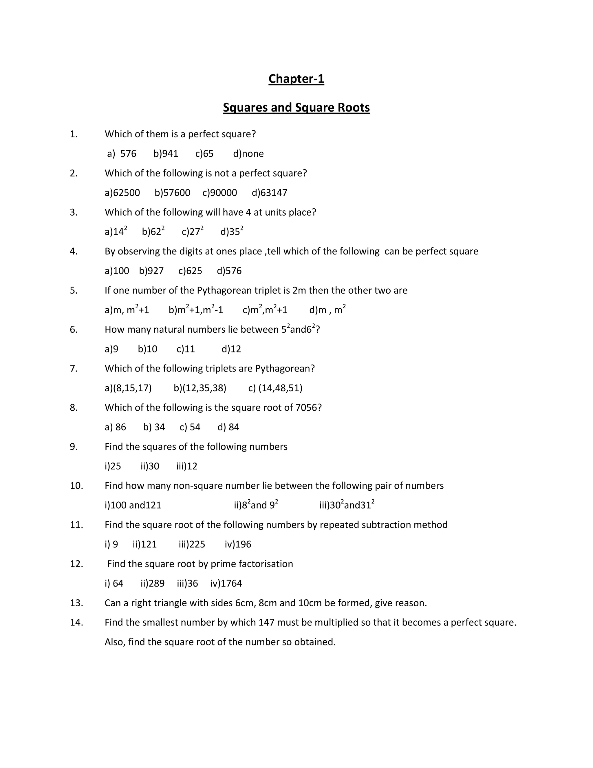 1. Squares and square roots are discussed, including perfect squares, square roots using various methods like prime factorization and long division, Pythagorean triplets, and properties of squares.