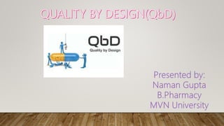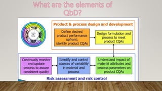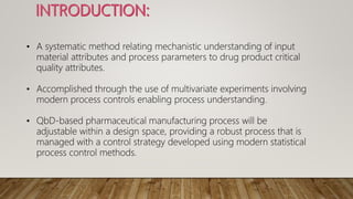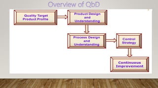 The document discusses Quality by Design (QbD), which is a systematic approach to pharmaceutical development that begins with predefined objectives and emphasizes product and process understanding based on sound science and quality risk management. QbD involves determining critical quality attributes, understanding how raw materials and process parameters affect those attributes, developing a design space and control strategy to manage the product lifecycle. Design of experiments is a key QbD tool that involves screening factors, response surface methodology, formulation evaluation, computer modeling and validation to optimize the process and enable scale up.