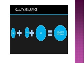 Quality control and quality assurance are important for ensuring accurate lab results. Quality control involves regularly testing controls of known values to monitor a test's performance. Key quality control statistics include the mean and standard deviation, which are used to calculate control limits on a Levey-Jennings chart. Westgard rules provide standards for determining when a test is out of control based on control values. Quality assurance encompasses the overall programs and procedures that a lab follows to ensure accurate and reliable results. It has strategic, tactical, and operational levels.