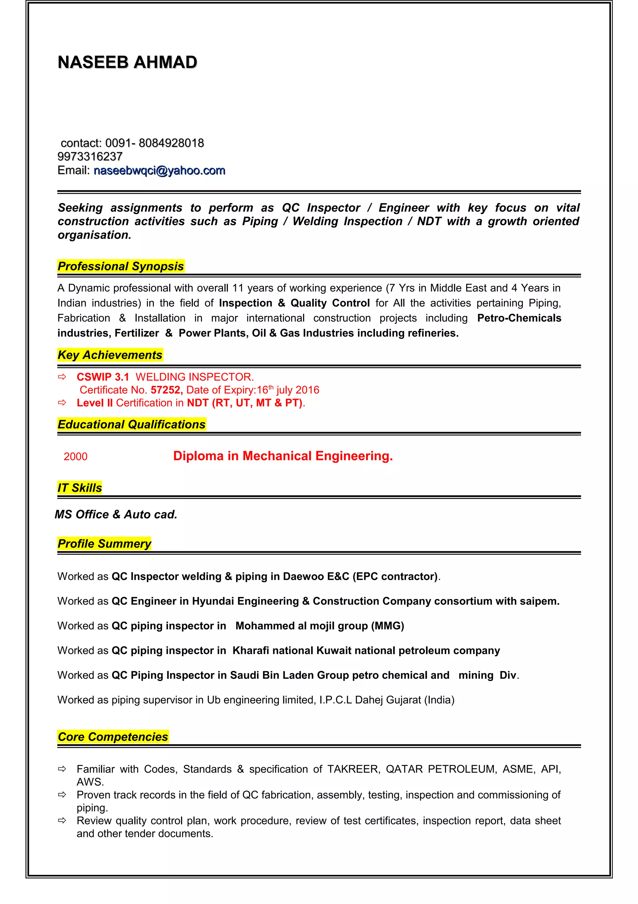 This document contains the resume of Nasir Ahmed, who has over 11 years of experience as a Quality Control Inspector and Engineer focusing on piping, welding inspection, and non-destructive testing. He is seeking new assignments with a growth-oriented organization. His experience includes working on major construction projects in the Middle East and India for industries including petrochemicals, fertilizers, oil and gas, and power.