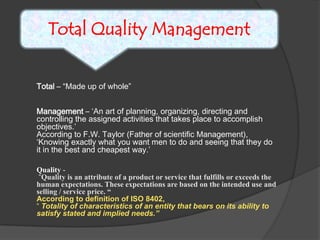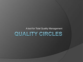 Quality Circles are small groups of employees who voluntarily meet regularly to identify, analyze, and provide solutions to work-related problems. The goals of Quality Circles include improving quality, productivity, and morale. They utilize techniques like brainstorming, control charts, flowcharts and checksheets to solve problems. Quality Circles require management support, appropriate training, and well-defined roles for leaders, facilitators, coordinators and members. Organizations that have implemented Quality Circles successfully include Xerox, United Airlines, and BHEL in India. Quality Circles provide both tangible benefits like cost savings and quality improvements as well as intangible benefits such as increased motivation, skills development and better communication.