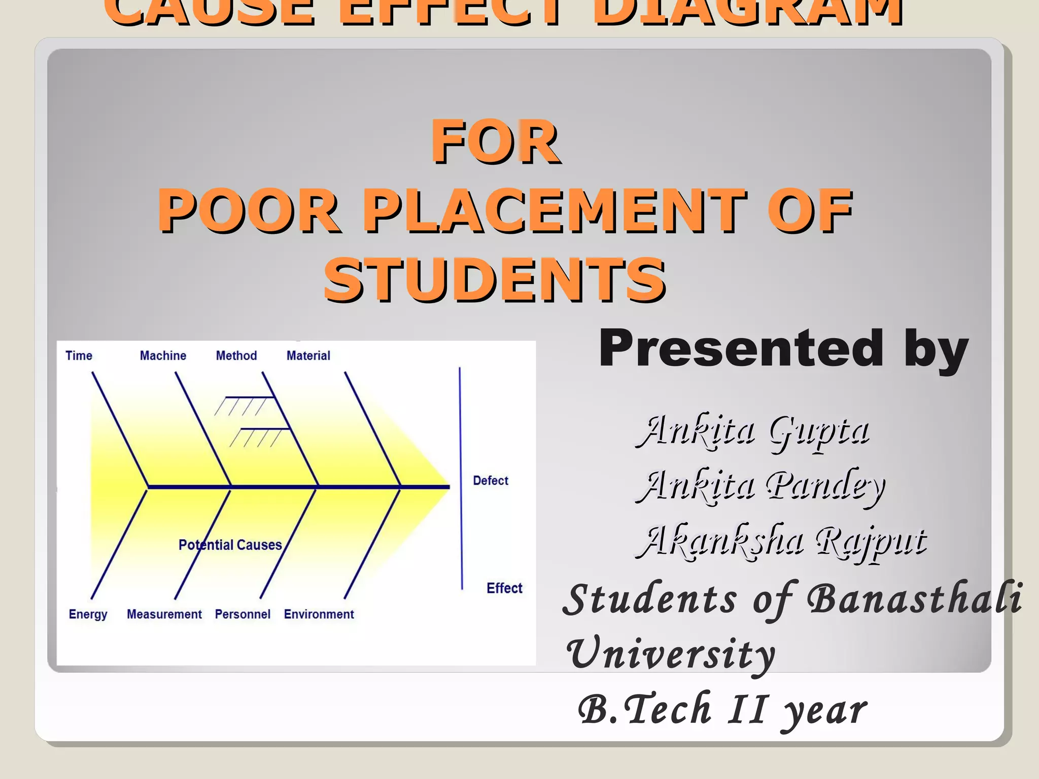The document discusses using a cause-effect diagram to analyze the root causes of poor student placement. It presents a cause-effect diagram with main causes like quality of education, corporate culture, self, and environment. Specific sub-causes are identified under each main cause like lack of quality faculty, theoretical education, poor college reputation, and lack of soft skills. Recommended solutions are provided to overcome the root causes by improving education quality, increasing job opportunities, attracting major recruiters, developing job aspirants, and aligning college and corporate culture. The team learned how cause-effect diagrams can identify relationships between problems and causes to take corrective actions.