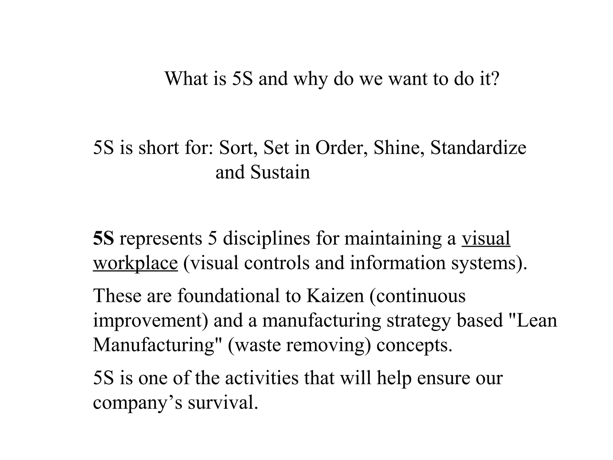 This document provides an overview of 5S, which refers to five disciplines for maintaining a visual workplace: Sort, Set in Order, Shine, Standardize, and Sustain. It describes each of the 5S disciplines and provides examples of applying them to organize and clean a work area. It also introduces related concepts from Lean Manufacturing like identifying and reducing different forms of waste. The goal of 5S is to create a cleaner, safer, and more efficient work environment through visual controls and standardized processes.