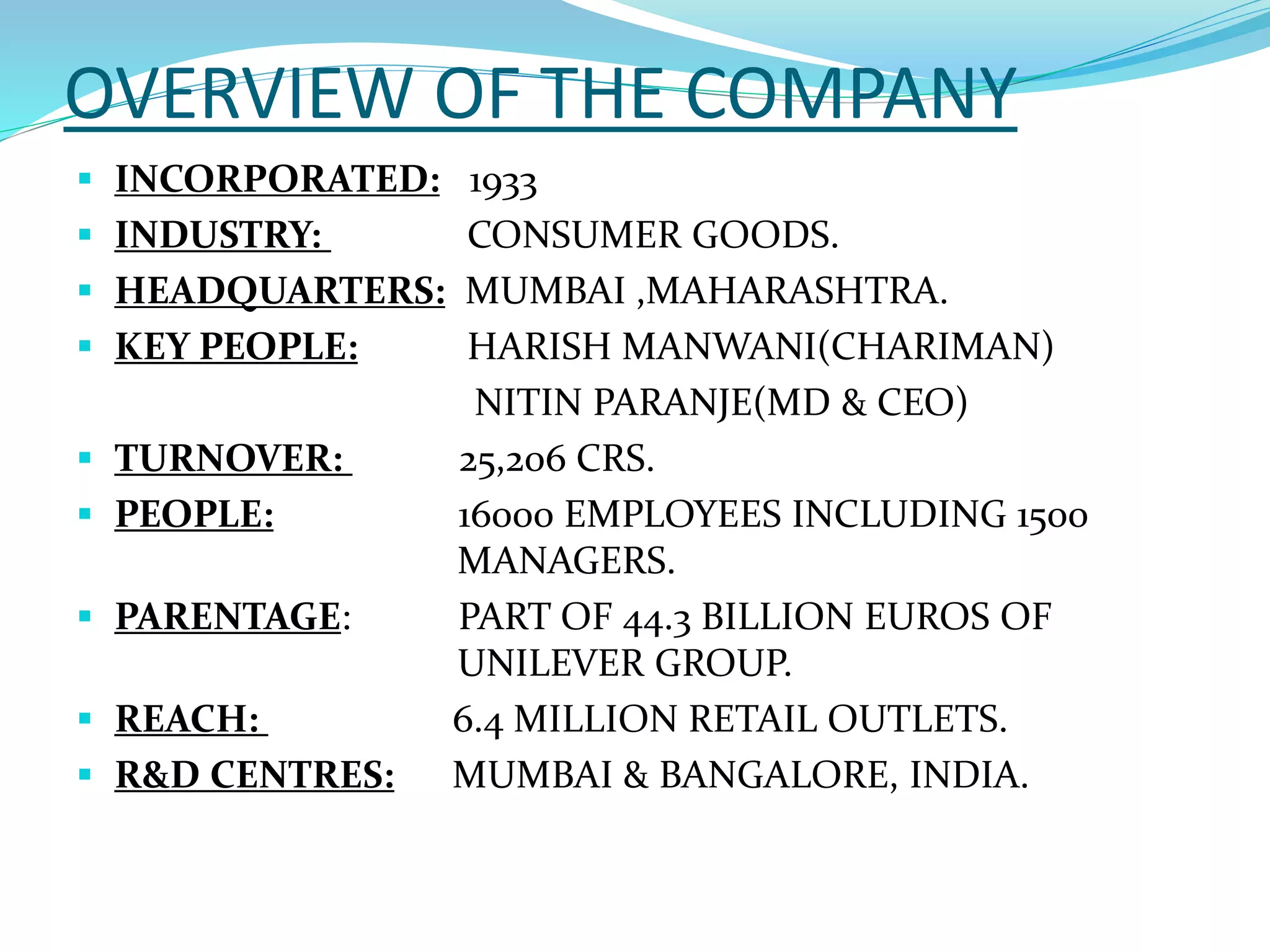 Hindustan Unilever Limited (HUL) is the largest fast-moving consumer goods (FMCG) company in India, with a portfolio of over 35 brands across 20 product categories. It is a majority-owned subsidiary of British-Dutch company Unilever. HUL aims to add vitality to life through its vision of helping people feel good, look good, and get more out of life. Key practices that have contributed to HUL's success include strong supply chain management, continuous innovation, and initiatives focused on social responsibility and environmental sustainability.