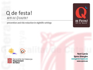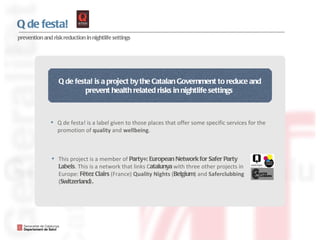 Q de festa! is a project by the Catalan Government to promote health and reduce risks in nightlife settings. It provides a label for venues that offer basic services like health information, staff training, and free water. The label is part of a larger European network of safer party initiatives. Q de festa! also offers promotional support and resources to partner clubs and venues.